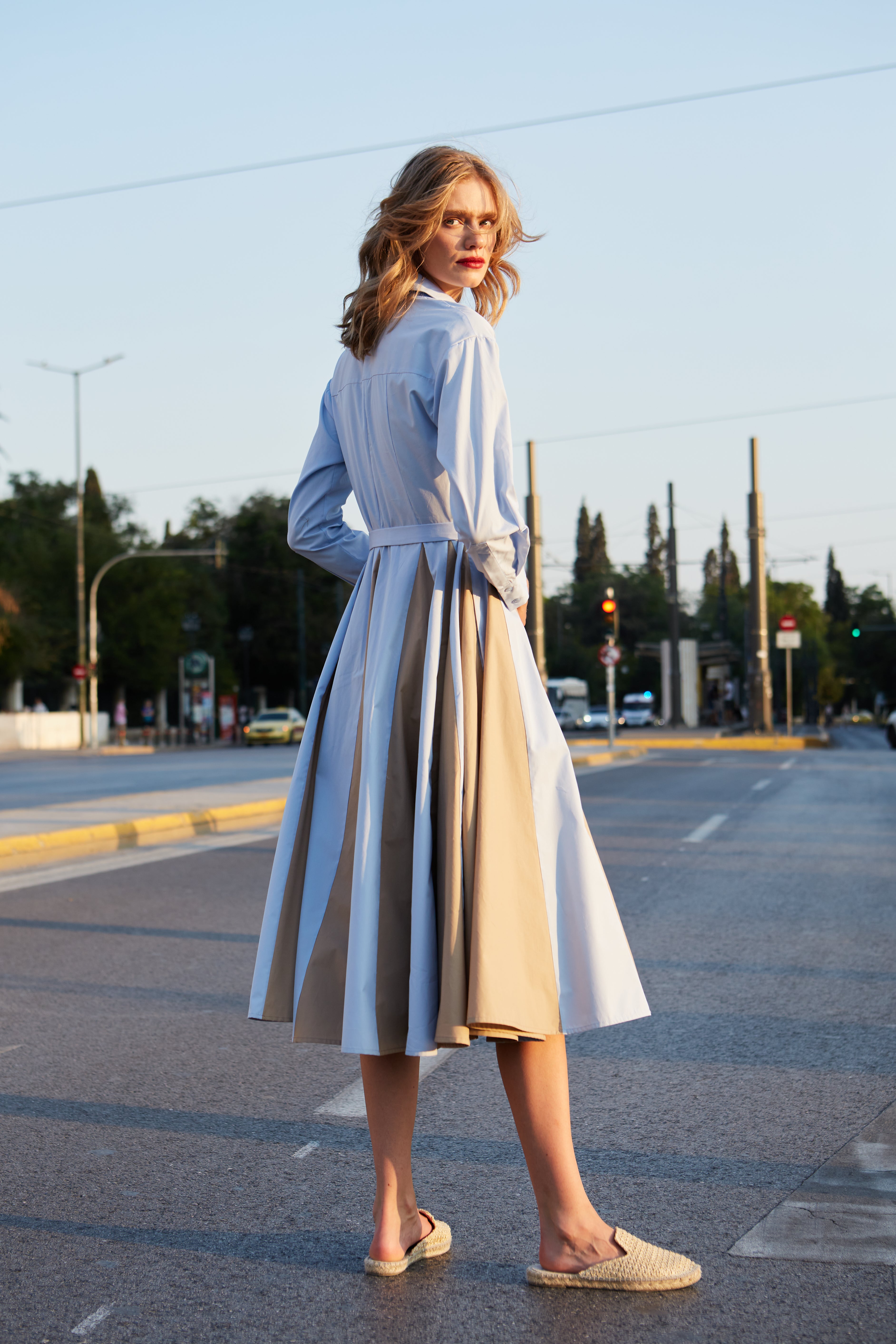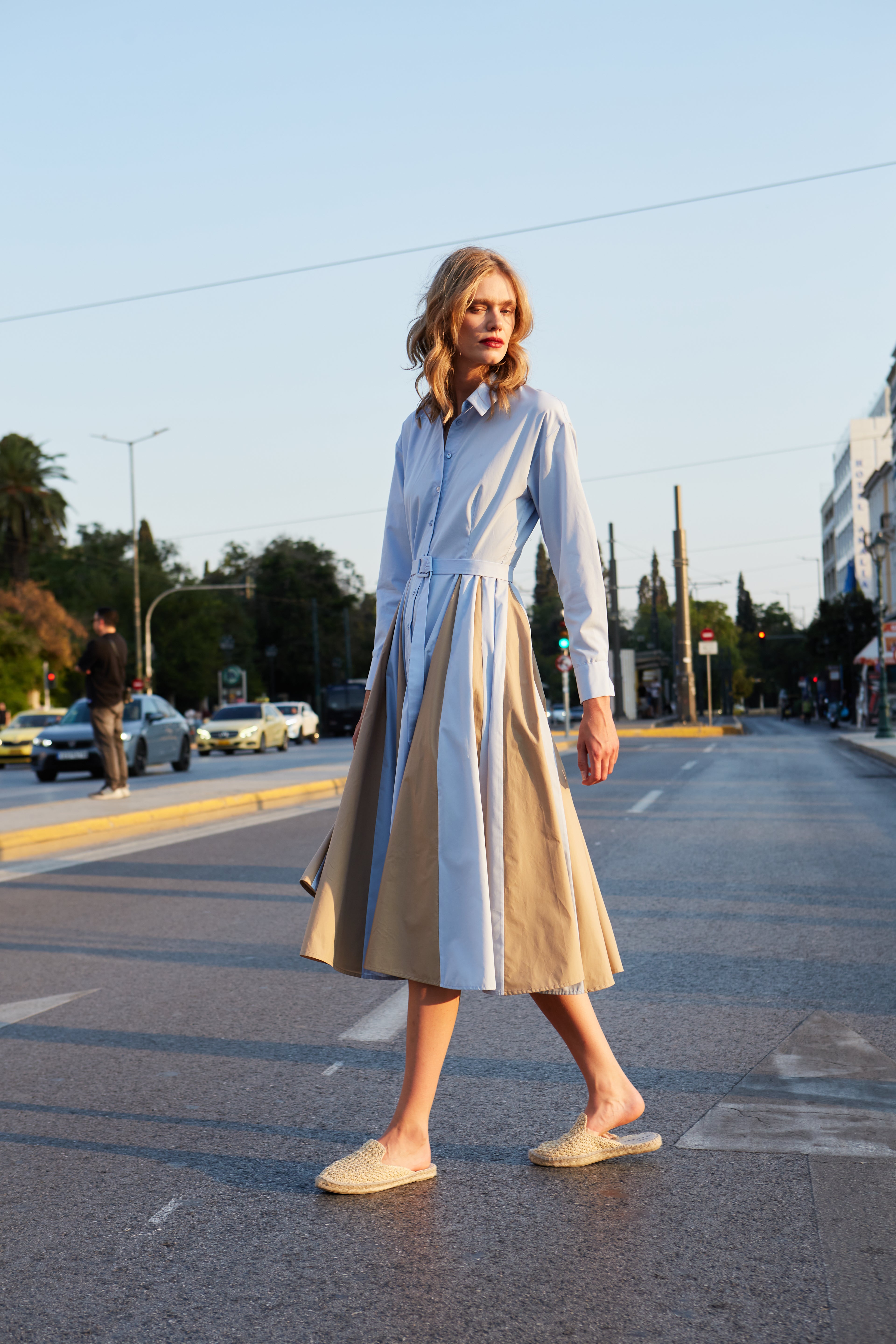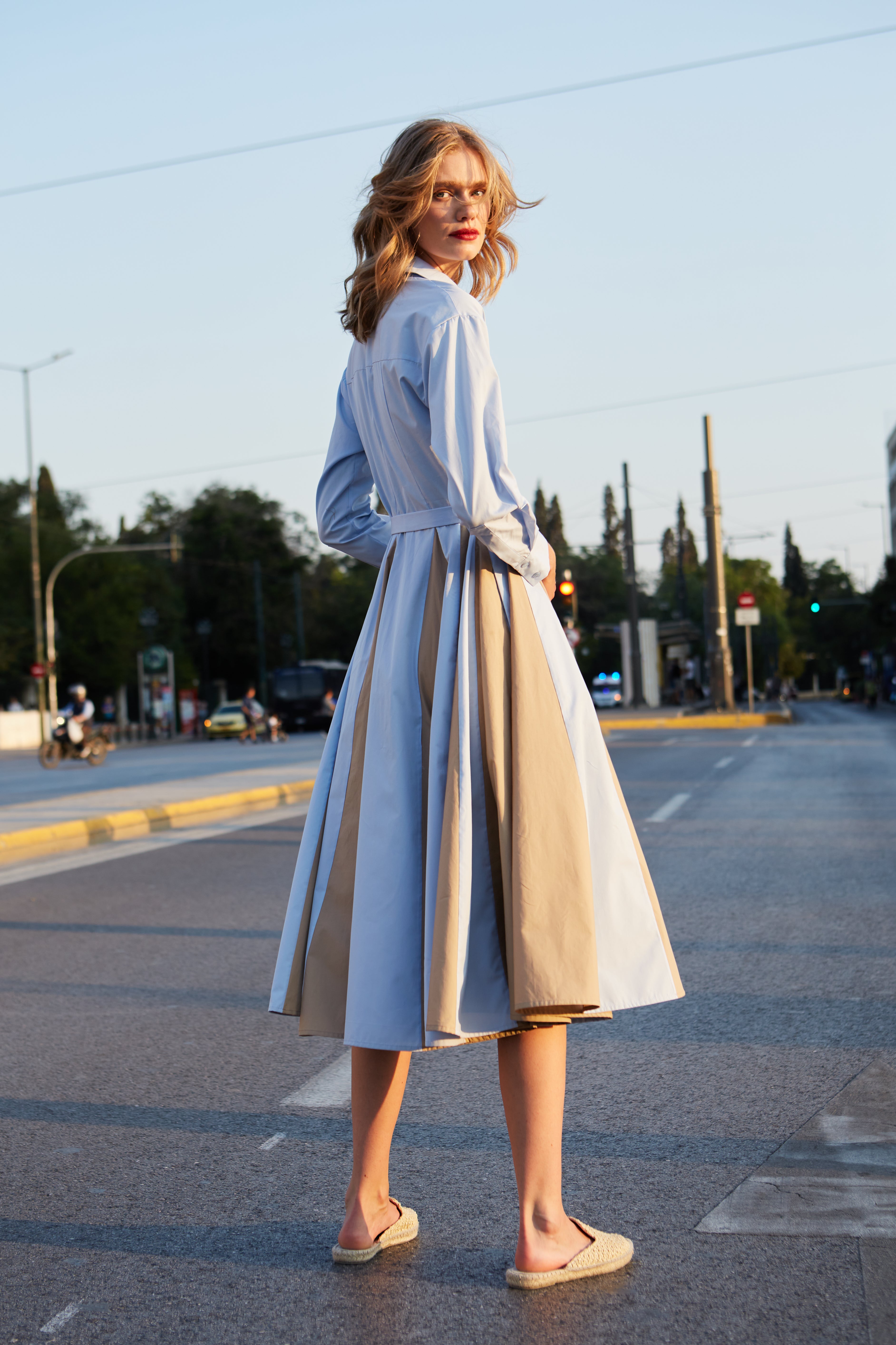 Midi shirtdress in light blue and beige