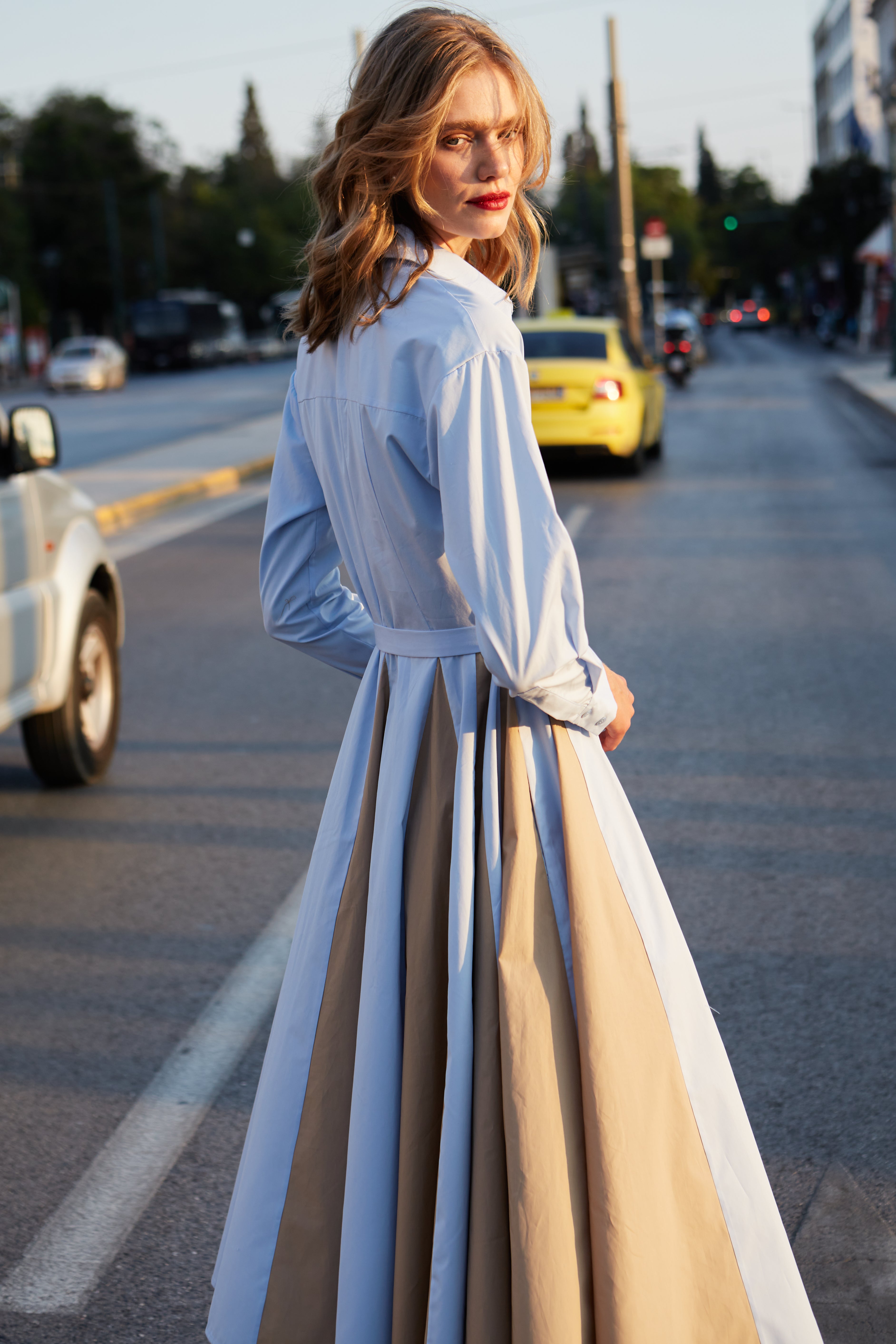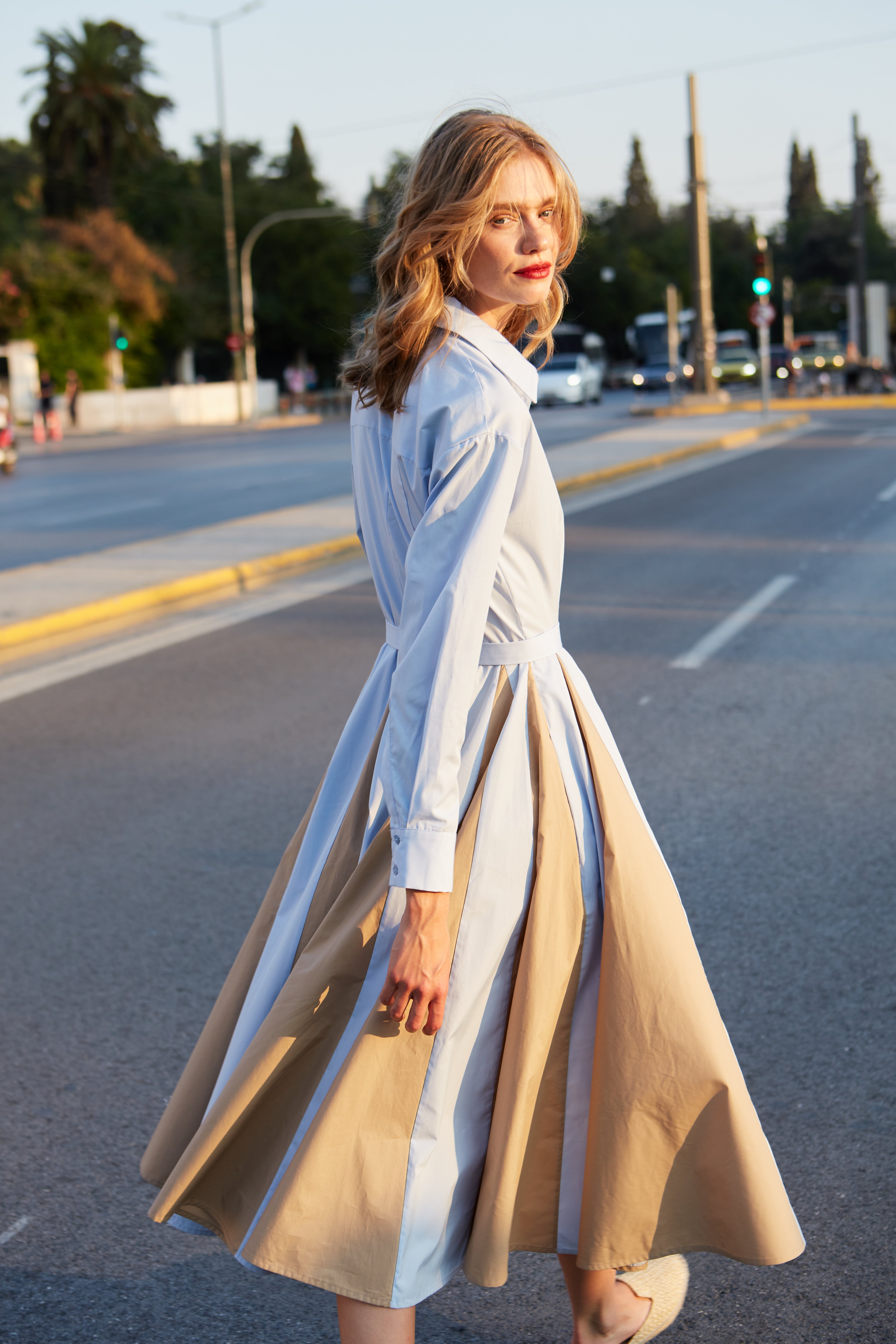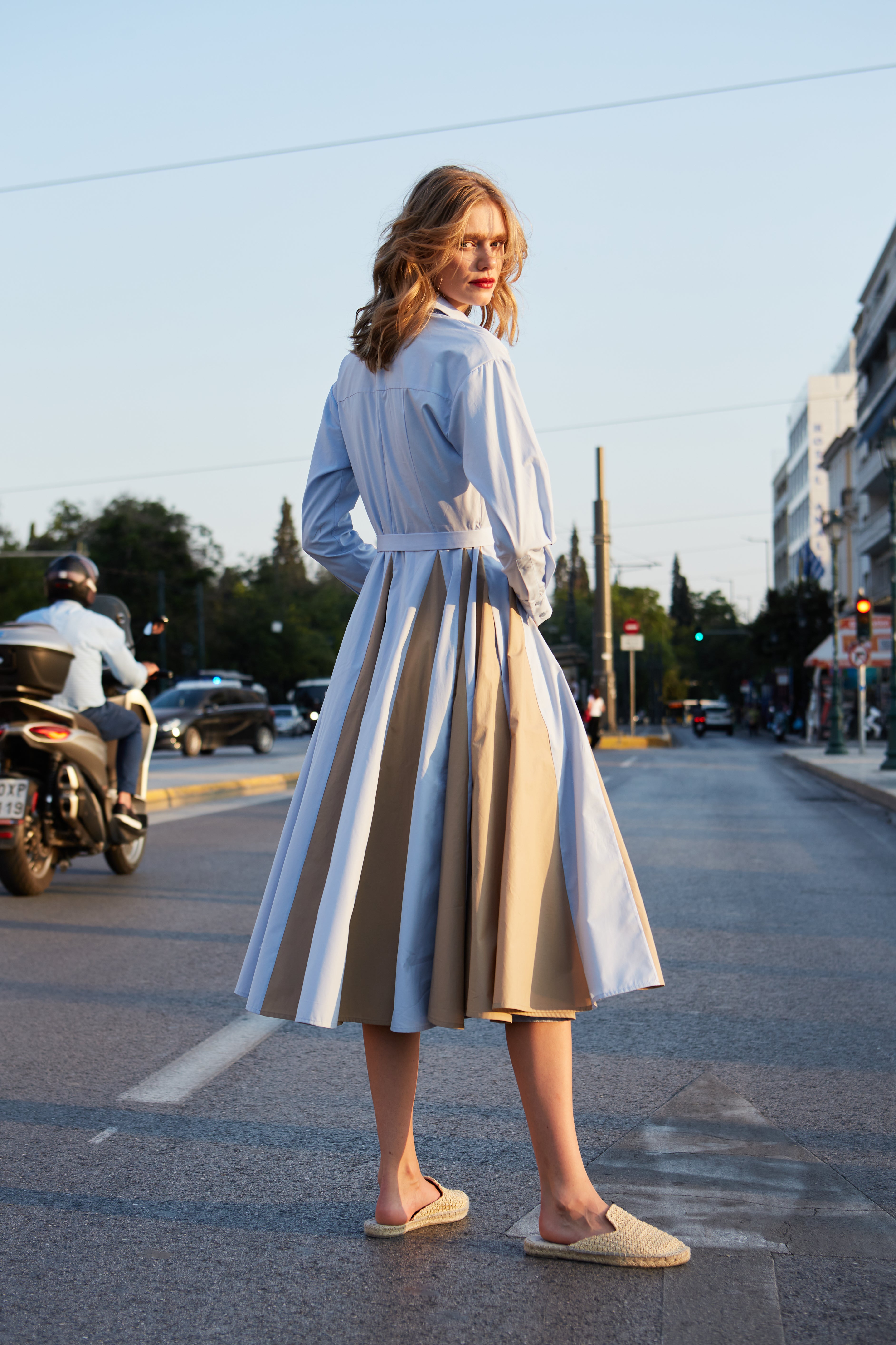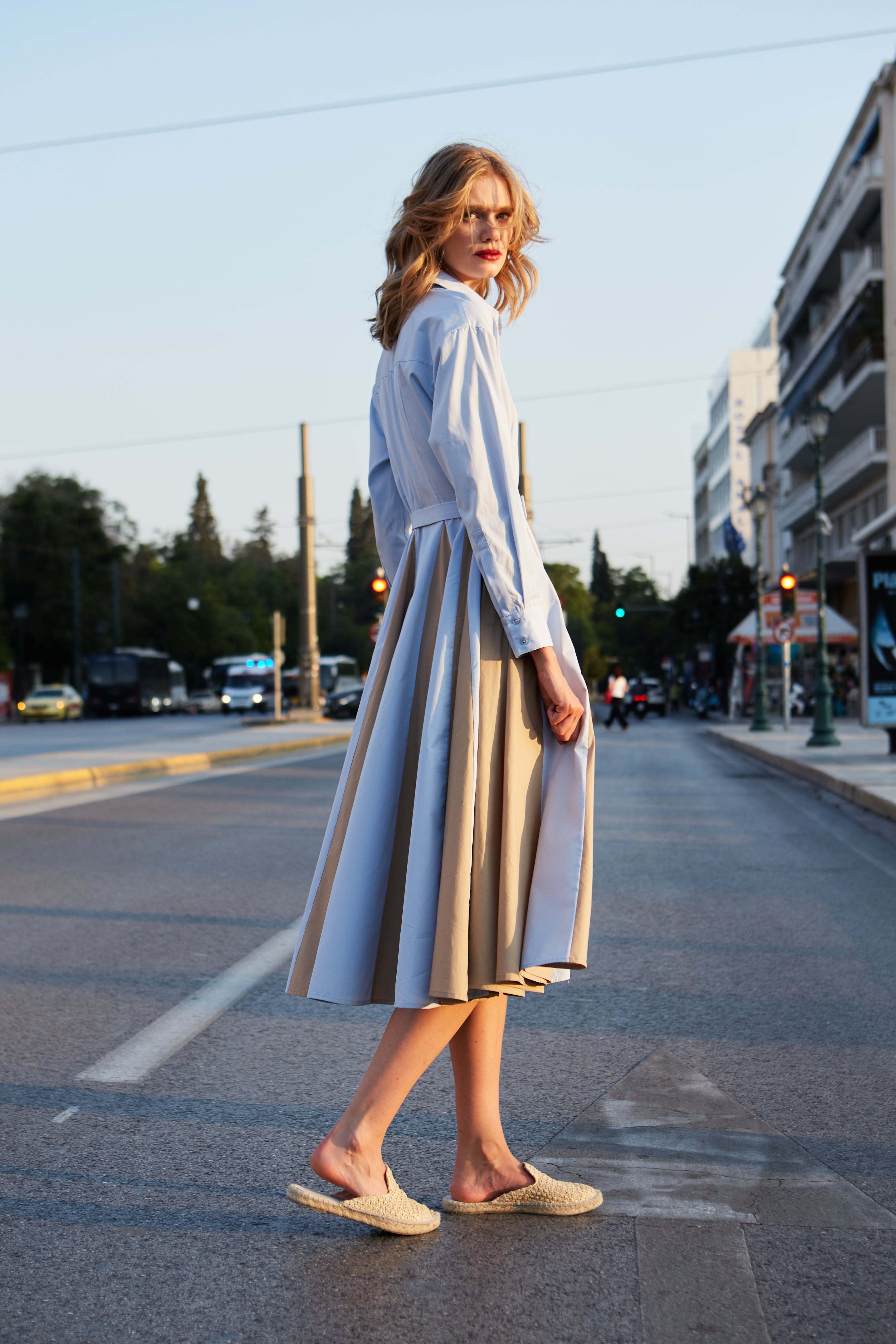 Midi shirtdress in light blue and beige